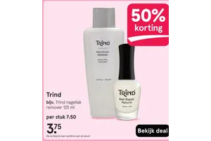 De aanbieding geldt voor het product Nagellak remover uit de categorie Nagelverzorging. De actieprijs van het goedkoopste product in deze aanbieding is €3,75. Helaas is deze aanbieding afgelopen, bekijk andere aanbiedingen van Trind.